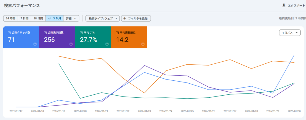 Googleサーチコンソールによる検索パフォーマンスは以下の通り。