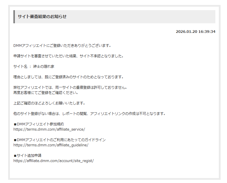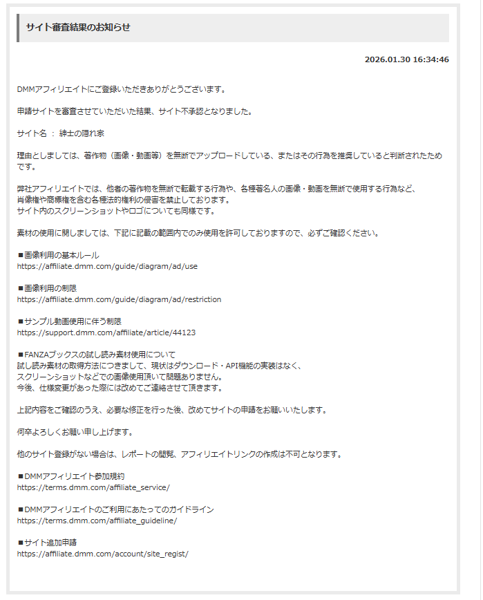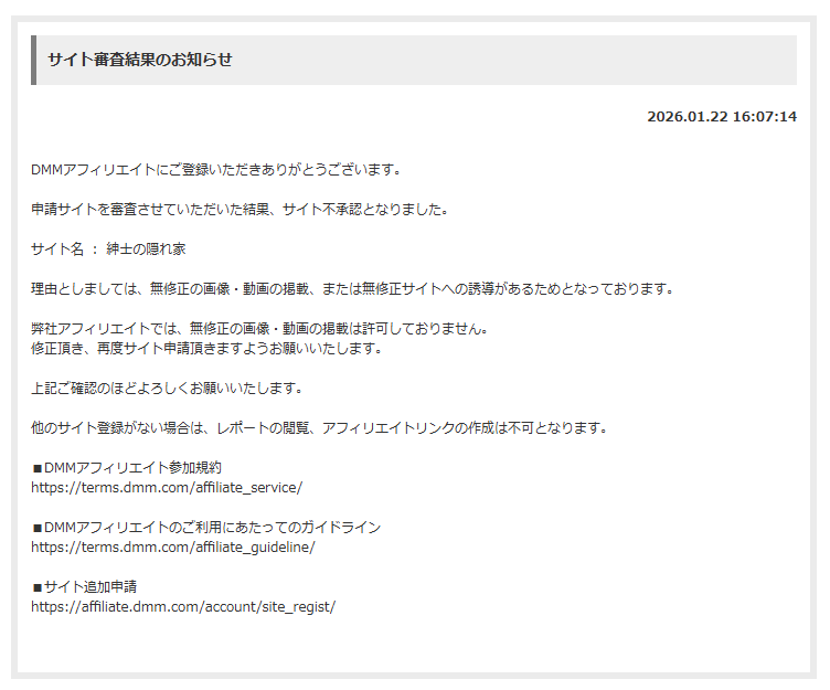 本題はここからで、実は当サイトはDMMアフィリエイトに落ち続けている。