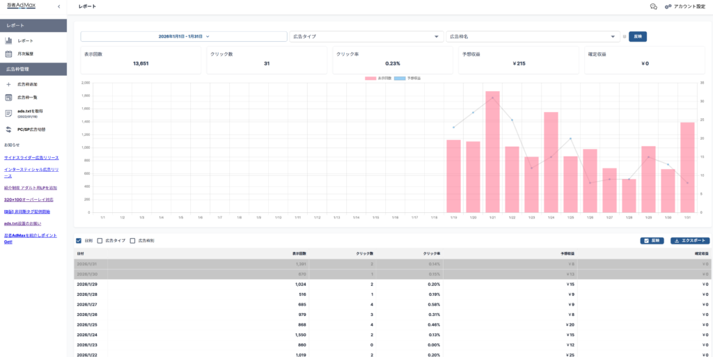 忍者AdMAXのレポート。普通のブログでいうGoogleアドセンスみたいなものかな?