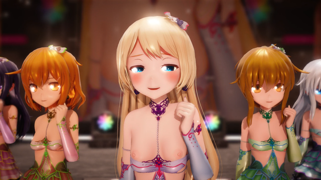 ソロMMD作品では1人のキャラクターをあらゆる角度から舐め回すように映すカメラワークが見どころになると思うんですが、複数人MMDの魅力はこの圧倒的な肌色率と数の暴力だと思います。裸の女の子がいっぱいならエロいっていう、もっとも原始的なスケベを感じることができるのが複数人MMDなんです。